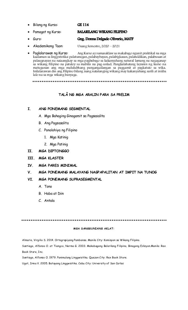 Balangkas Ng Mga Aralin Para Sa Balarila Ng Wikang Filipino